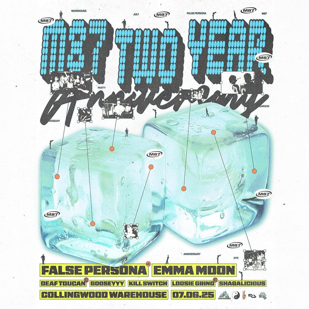 M87 turns two with their biggest party yet, taking over a hidden Collingwood warehouse on Saturday 7 June. Headlining is False Persona [UK], making his Melbourne debut fresh off the release of Crazy with Mall Grab, alongside Naarm favourite Emma Moon, returning after a huge national run and tours with Teletech. They’re joined by Deaf Toucan [Eora], gooseyyy, Loosie Grind [Eora], and Kill Switch B2B shagalicious (B!TE takeover), with Funktion-One sound and 60 square metres of lighting truss setting the scene.