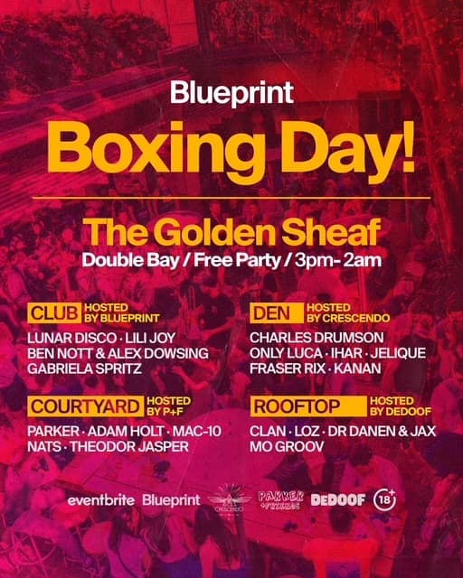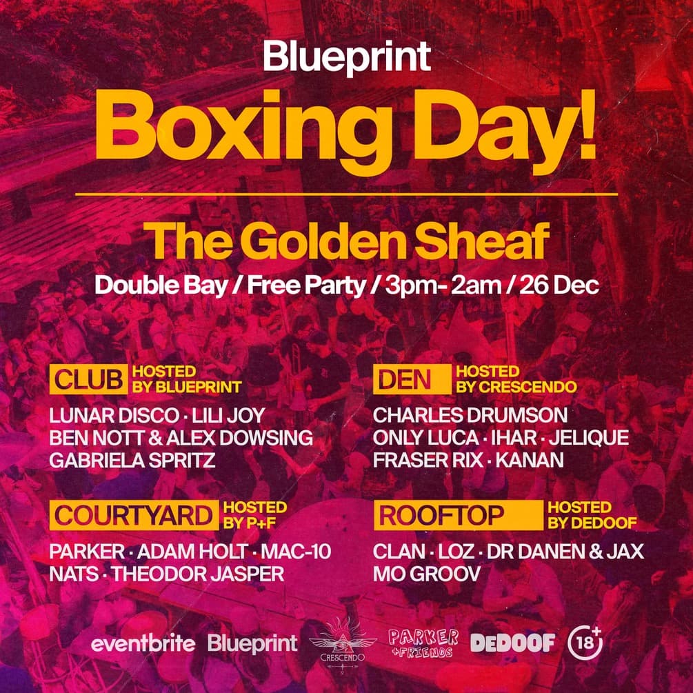 BLUEPRINT + Parker & Friends + Dedoof + Crescendo-FREE PARTY- BOXING DAY- @The Sheaf- Double Bay.