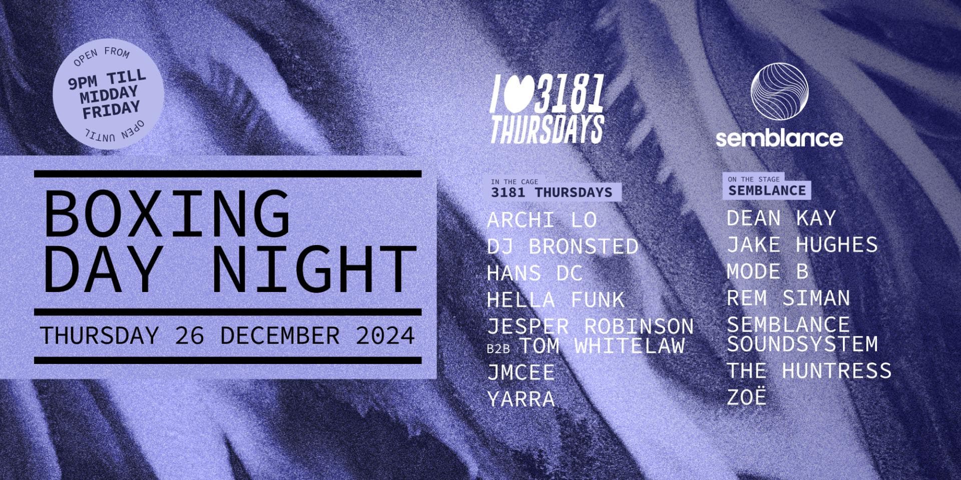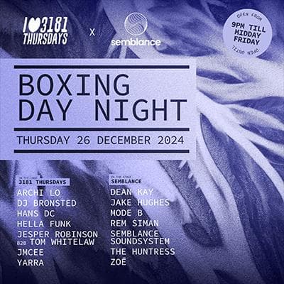 Continuing the festivities on Boxing Day Night, Semblance go deeeeep on the Stage in follow up to last years instalment, meanwhile 3181 Thursdays keep the Cage in motion until midday. Door sales only xx.