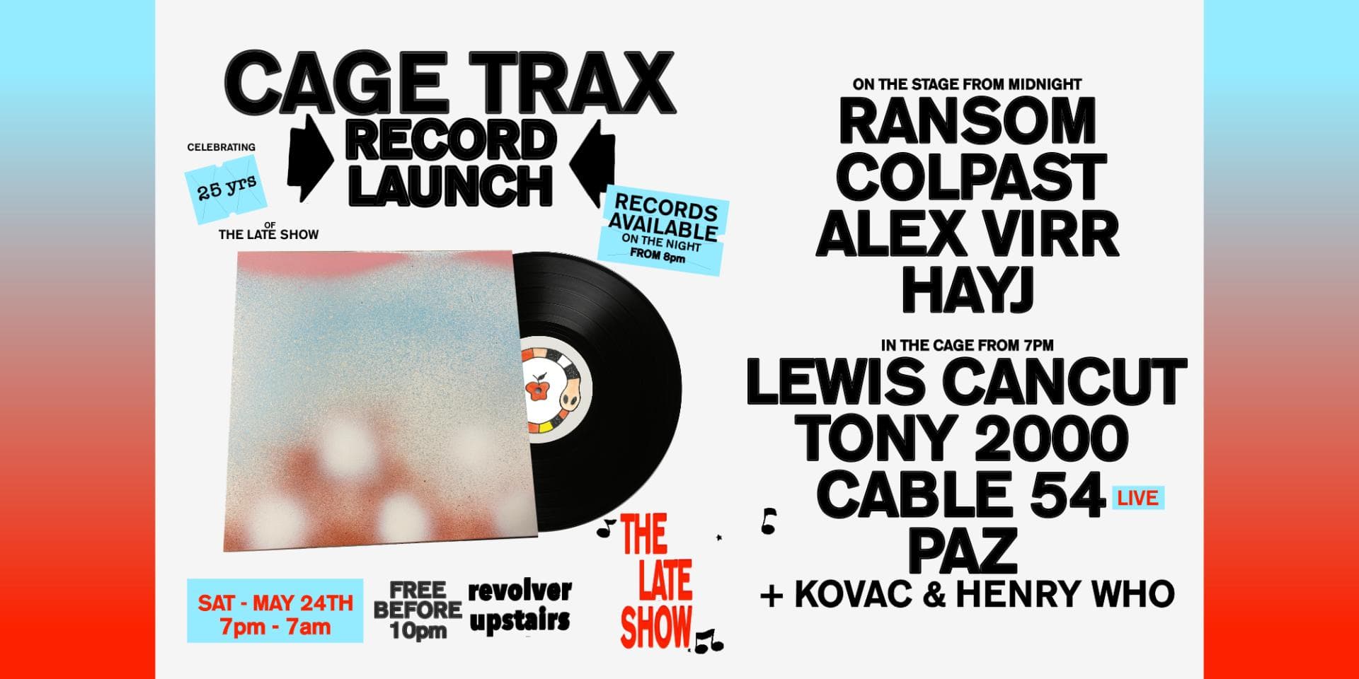 The Late Show has a strong tenure on club life, running consistently (beside lockdowns) for over 25 years at Naarm institution Revolver Upstairs. Heralded by the one and only DJ Ransom (cue Tribute To Scratching ), whose efforts in dance music kept the foundations solid from day dot, and progressed the sound of DJing from the birth of 2 Step to the now grown up speed garage at 150 bpms. Branched over 2 rooms, the sound of Saturdays was always topical, forward and bass heavy. To look back over the years, The Late Show has documented individual music moments, showcasing Baltimore Club, Nu School Breaks, UK Funky, Niche, Bassline, Baile Funk with all their sub genres and evolution mixed in. From Edit culture, blogging about fidget house, to USB swapping, listening parties and hosting international vibe messiahs, The Late Show's efforts combining great Djing and presenting upfront dance music has merited a trophy in the annals of clubbing, having lasted where others dropped off. So to celebrate such an occasion, The Late Show and Revolver Upstairs Records have put together a 4 track (5 if you buy digital) vinyl release, the premiere pie to roll off the lot. With tracks from TLS residents including Cable 54 (Ransom and Tonelab Damo), Tony 2000, Dj Snow Fleas (aka Lewis CanCut) and Paz, the recordings capture the sounds that emanate from the DJ cage, hence Cage Trax. The release party encourages you to come early (dinner time), as there is a limited amount of pressings on offer on the night, and each cover forms part of a larger mural (keeping each unit individual).