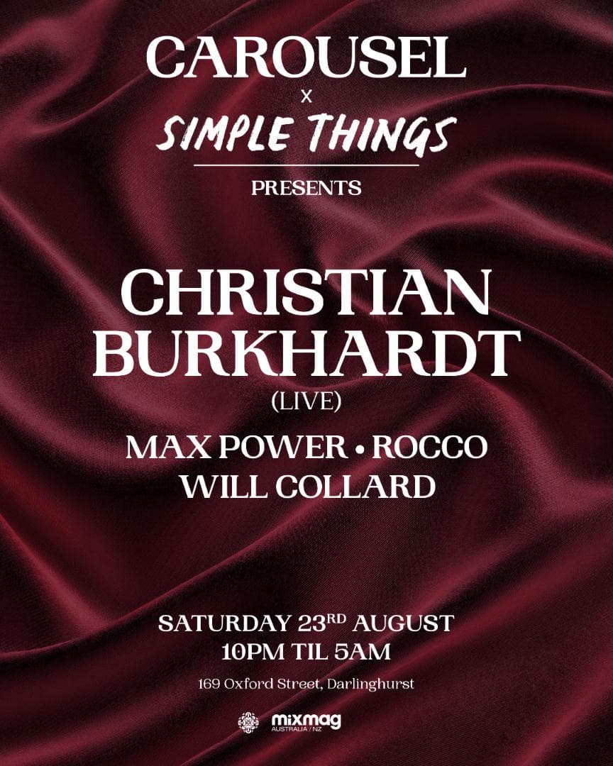 Joining forces, linking arms, and doing the Nutbush with our good pals over at Simple Things to beckon in the new season and welcome none-other than Christian Burkhardt back to Australian soil. It’s been a hot minute since we last had the pleasure of seeing Christian Burkhardt slinging slick house bombs in Sydney, so it’s our very great pleasure to welcome him back, this time bringing his new LIVE show to the Carousel booth.