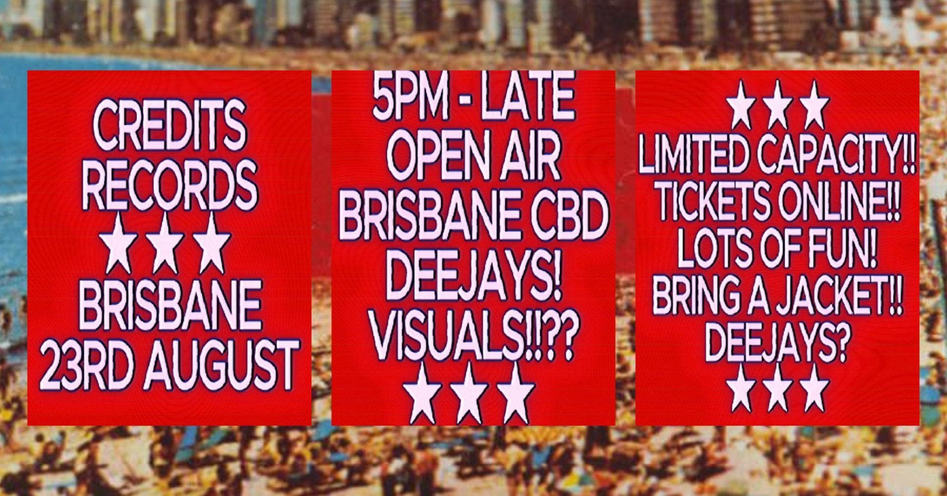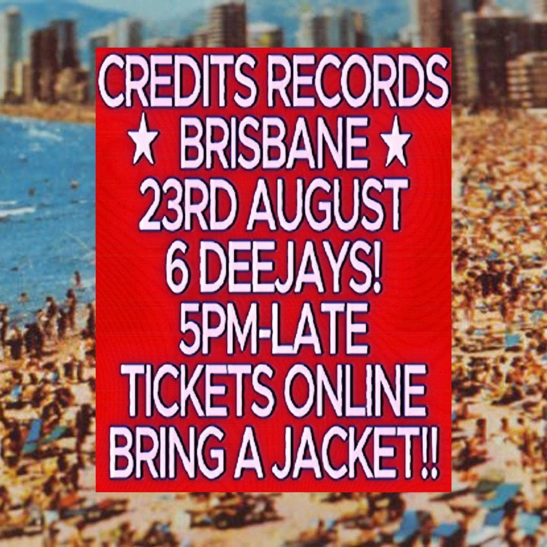 CREDITS RECORDS ★ BRISBANE ★ AUGUST 23 ★ 5PM - LATE ★ 6 DEEJAYS ★ VISUAL PROJECTIONS ★ LOTS OF FUN !! ★ DON'T FORGET A JACKET !! ★ DID WE SAY DEEJAYS? ★