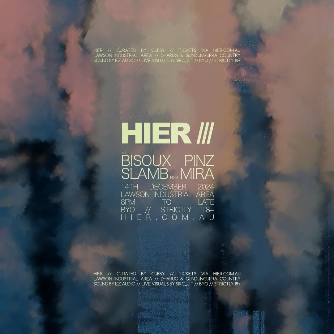 HIER is an ongoing collaboration between Dharug & Gundungurra based label CUBBY and SIRC_UIT, taking place at a permanent location in the Lawson Industrial Area. HIER’s aim is to expose audiences to a diverse line-up of established and emerging electronic music producers and DJs from Eora and beyond, playing amongst an ever-evolving immersive light installation and a purpose-built PA system by EZ Audio.