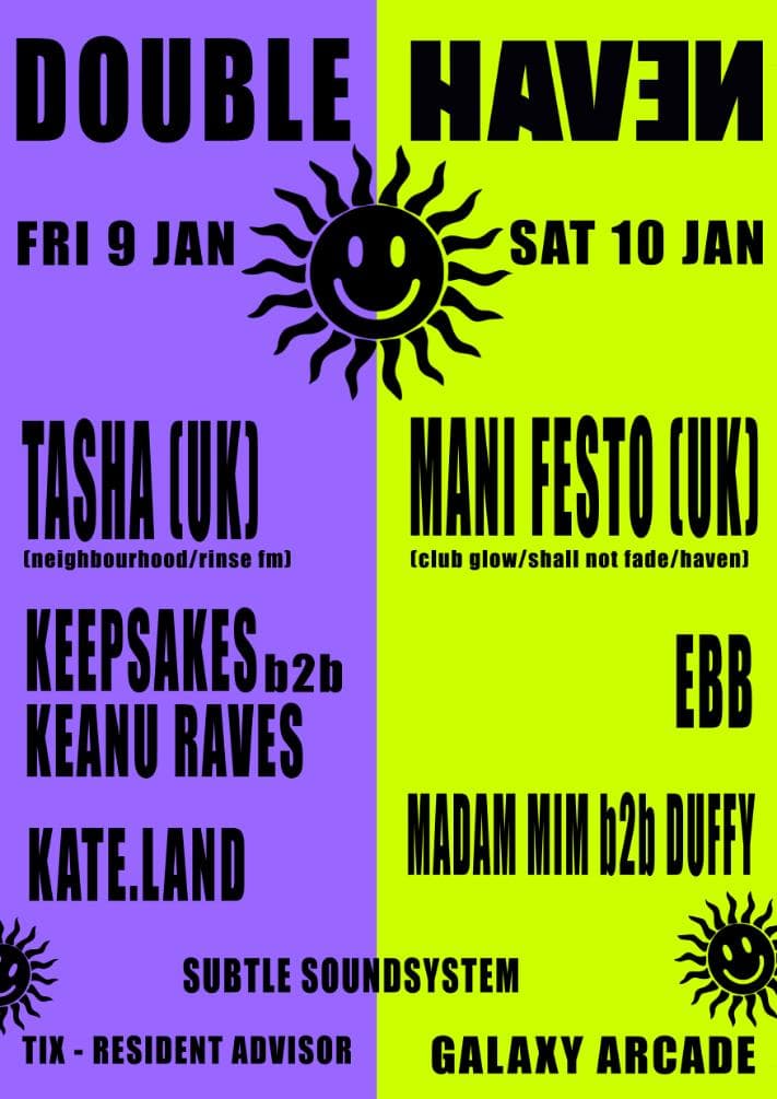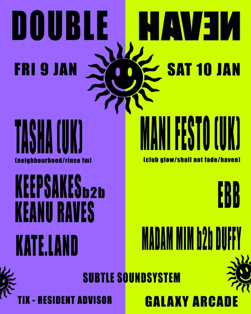DOUBLE HAVEN // Jan 9th: Tasha (UK, Neighbourhood) // Jan 10th: Mani Festo (UK, Club Glow)