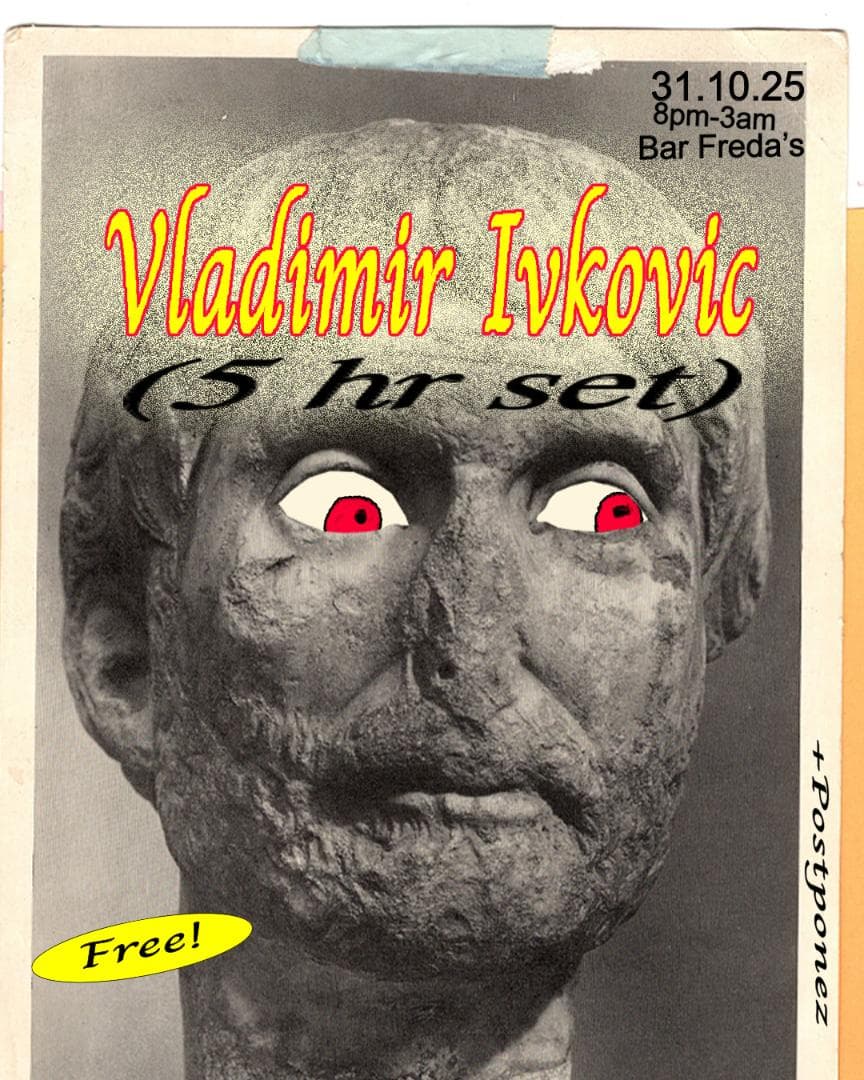 Vladimir Ivkovic descends upon the cosy confines of Bar Freda’s this Halloween for a rare, intimate 5 hour ritual. Known for his otherworldly selections and slow-burning sorcery behind the decks, the Salon des Amateurs legend and Offen Music honcho will guide dancers through a maze of hypnotic rhythms, cosmic oddities, and spine-tingling obscurities. Joined by local shapeshifter Postponez, expect all treats and no tricks as the night drifts between the beautiful, the bizarre, and the beyond. Costumes mandatory! FREE ENTRY!