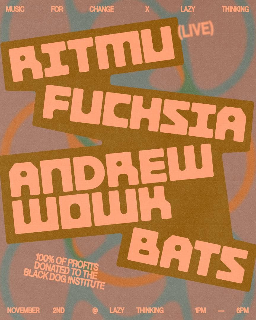 Music For Change team up once again with Lazy Thinking (2024 FBI Radio SMAC Awards winner) to bring you an afternoon of leftfield, eclectic and downtempo electronic music. 100% of profits will be donated to The Black Dog Institute, a not-for-profit organisation pioneering mental health research, clinical services, digital tools, and educational resources.