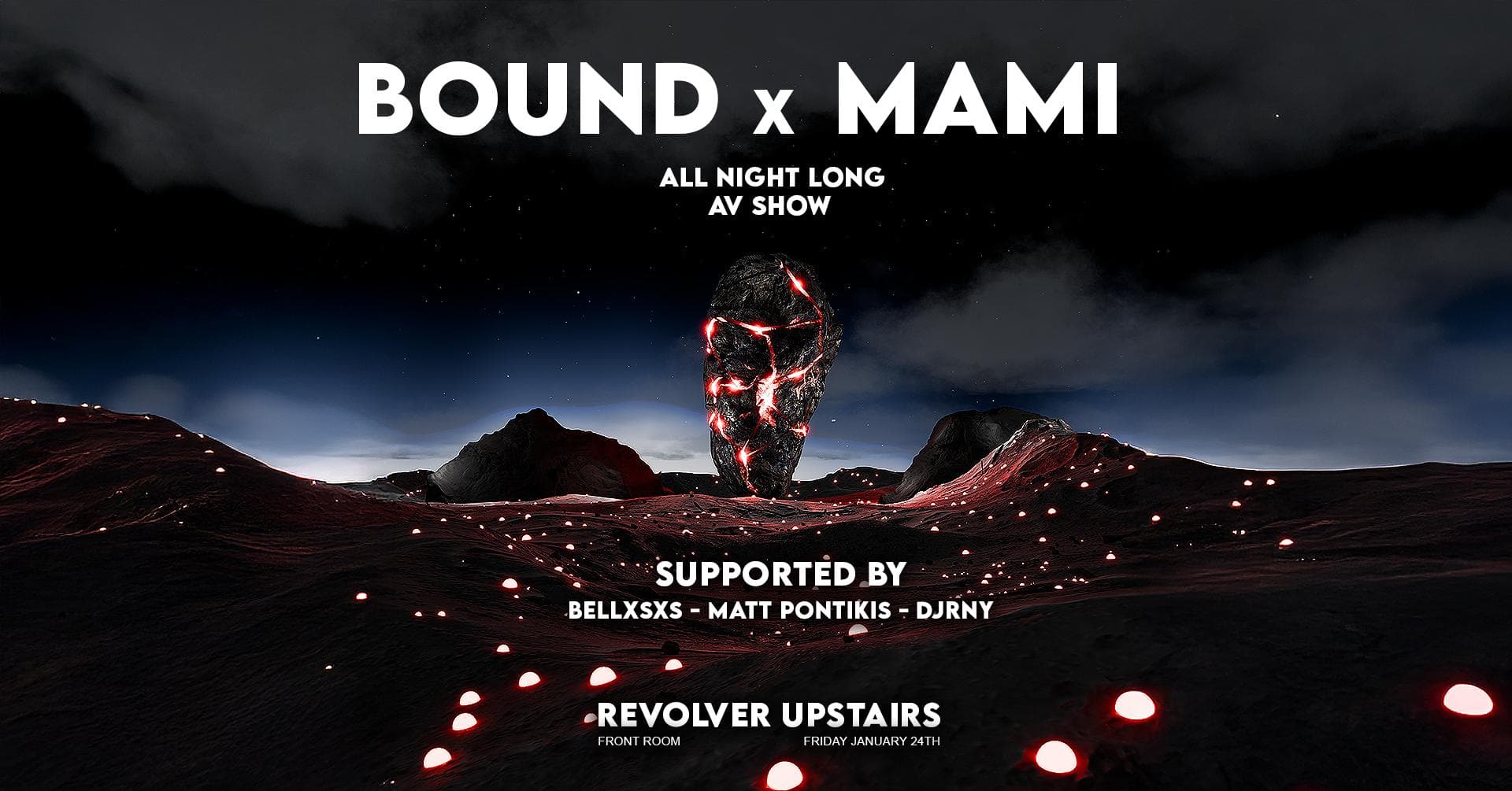 On Friday, January 24th, Bound and MAMI will return to Revolver Upstairs, once again transforming the Front Room with meticulously curated lighting production and an accompanying animation show, creating an immersive atmosphere for the evening.