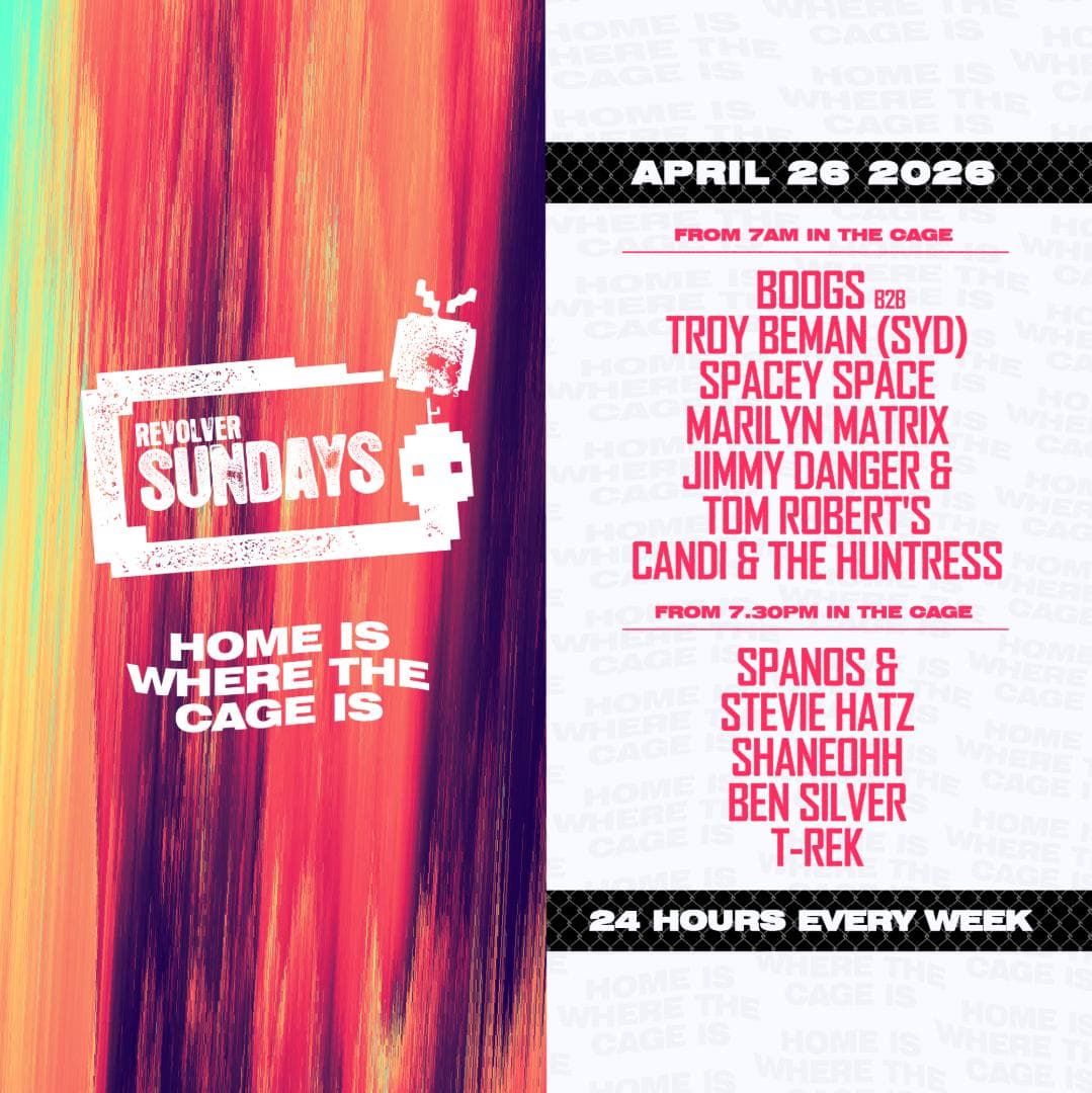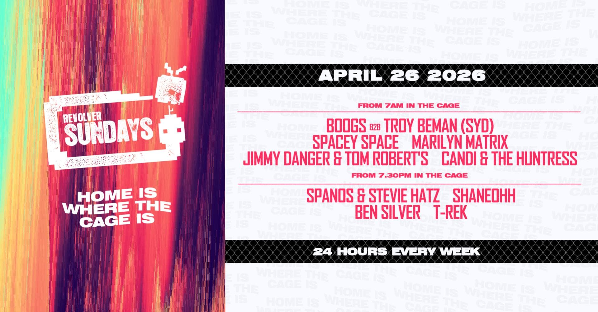 Revolver Sundays, an all day electric disco party is one of the world's most unique clubbing experiences - tight like family, welcoming like long lost friends and moved by a ceaselessly throbbing beat provided by five of Melbourne's most revered DJ’s: Boogs, Spacey Space, T-Rek, Radiator, Silversix, Brian Fantana, plus special guests.