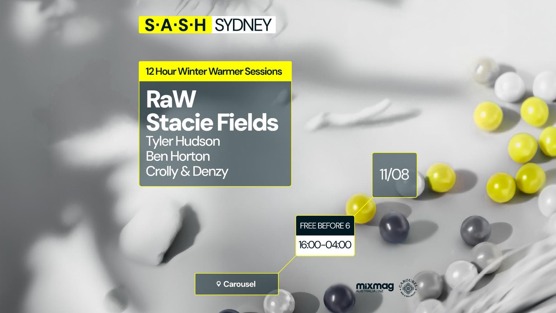 Birthday girl Stacie Fields checks into the red abyss once again with her recent studio work being nothing short of steeze. Stacie's experience proves she knows a thing or two about romper stompers, as she’s played all over Aus in any and every setting. RaW turns things up a notch to get down and dirty within the walls of Carousel, the two Brazilians pack serious records into their bags, and play them in an even more serious manner. Tyler Hudson zooms back to Carousel with his bag of tricks and goes head on with the close in a battle of enormous feats & beefy beats. Ben Horton jumps for joy as his studio work has been exceptional, with a recent release on DWAAL proving he means business. Central coast couple Crolly & Denzy receive a warm welcome from Carousel for impressive efforts in recent times as they prove they’re here to stay.