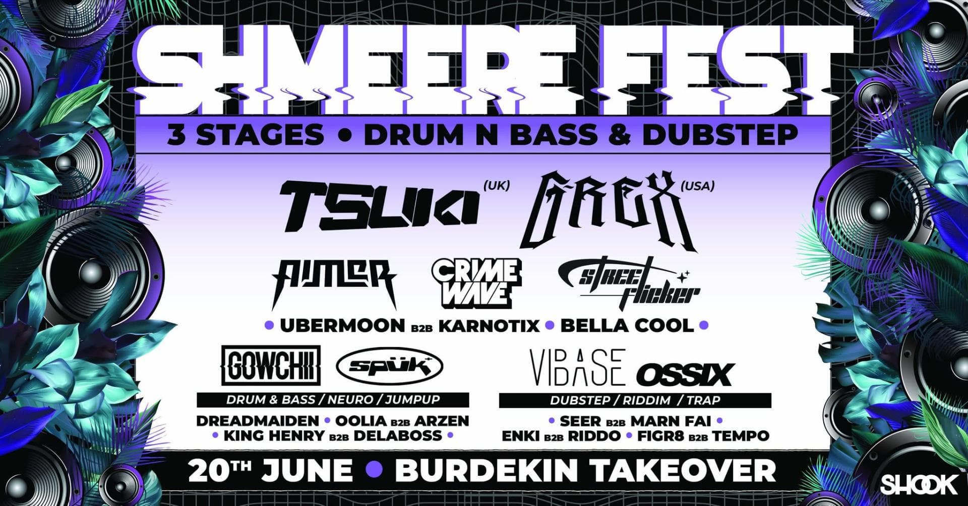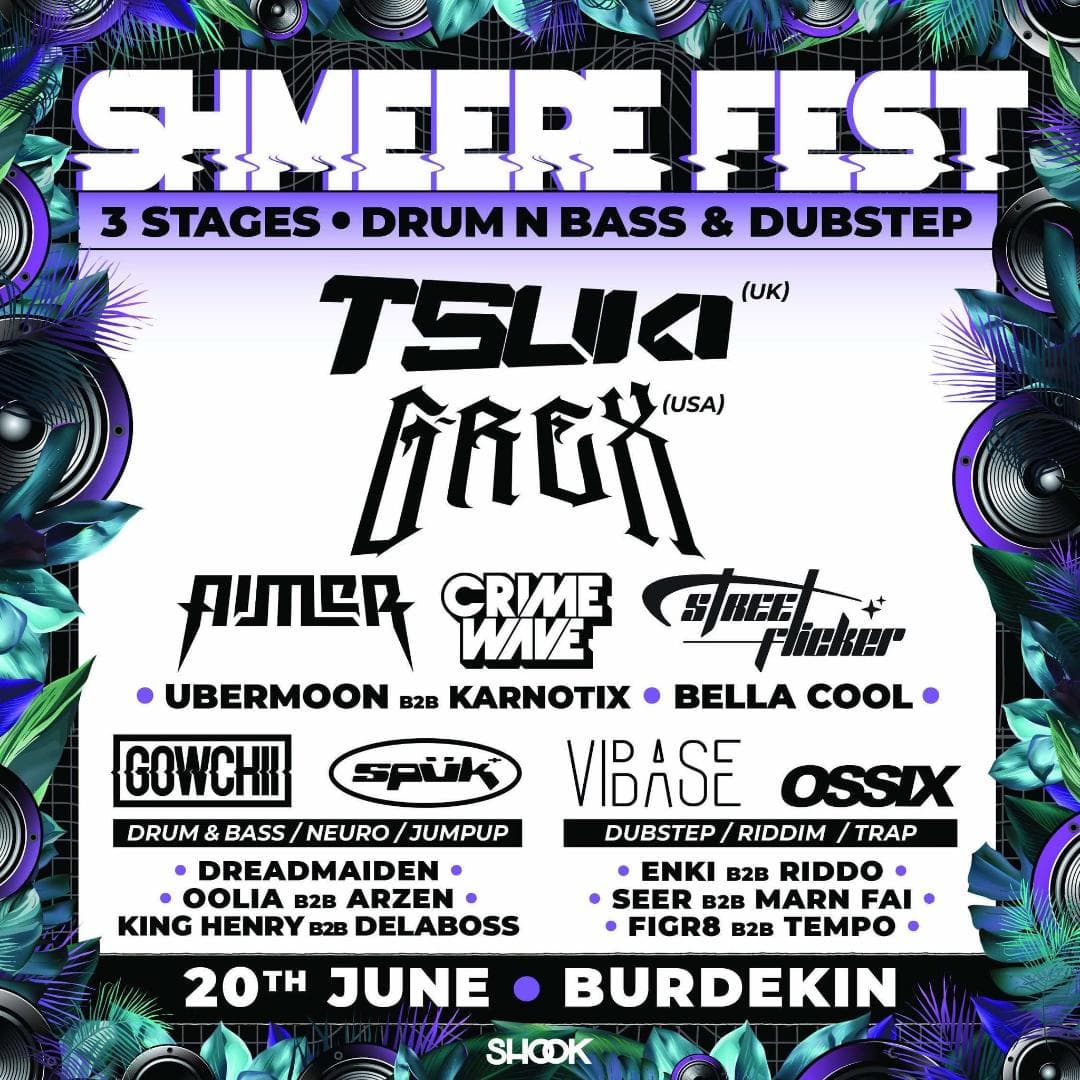 SHOOK is over the moon to announce the second ever SHMEERE FEST featuring an insanely stacked lineup of local and international bass artists over 3 STAGES at the Burdekin hotel.