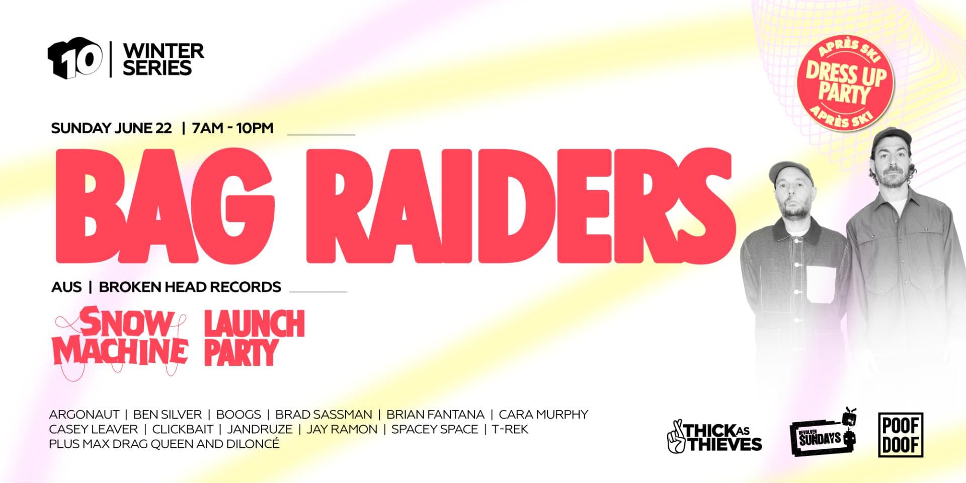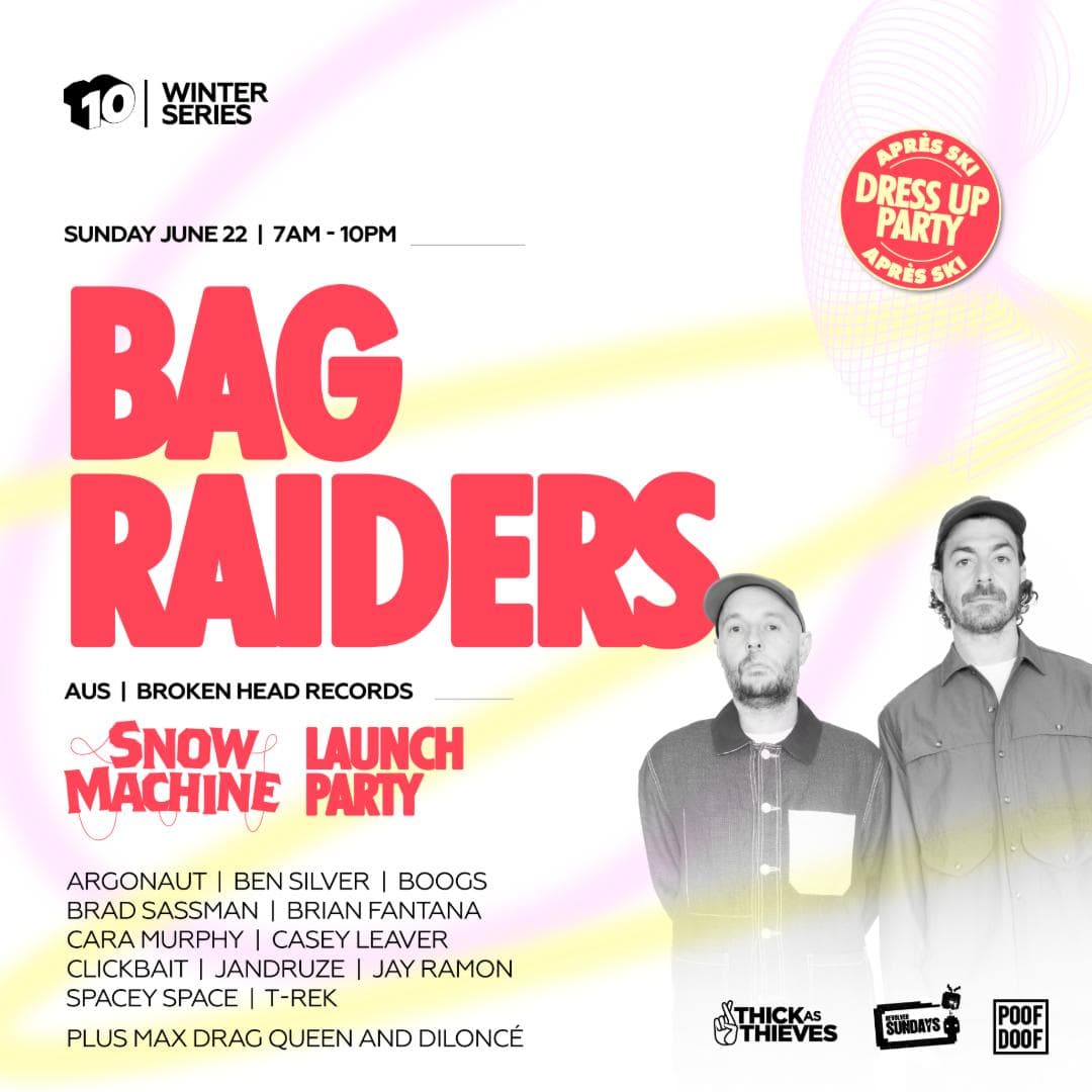 Apres all day? You know it! To celebrate our Revolver & Thick as Thieves package any Snow Machine Queenstown, we're bringing the slopes to the cage! Expect full winter party energy as BAG RAIDERS return to the cage, alongside Revolver residents, and the Poof Doof and Thick as Thieves all stars.