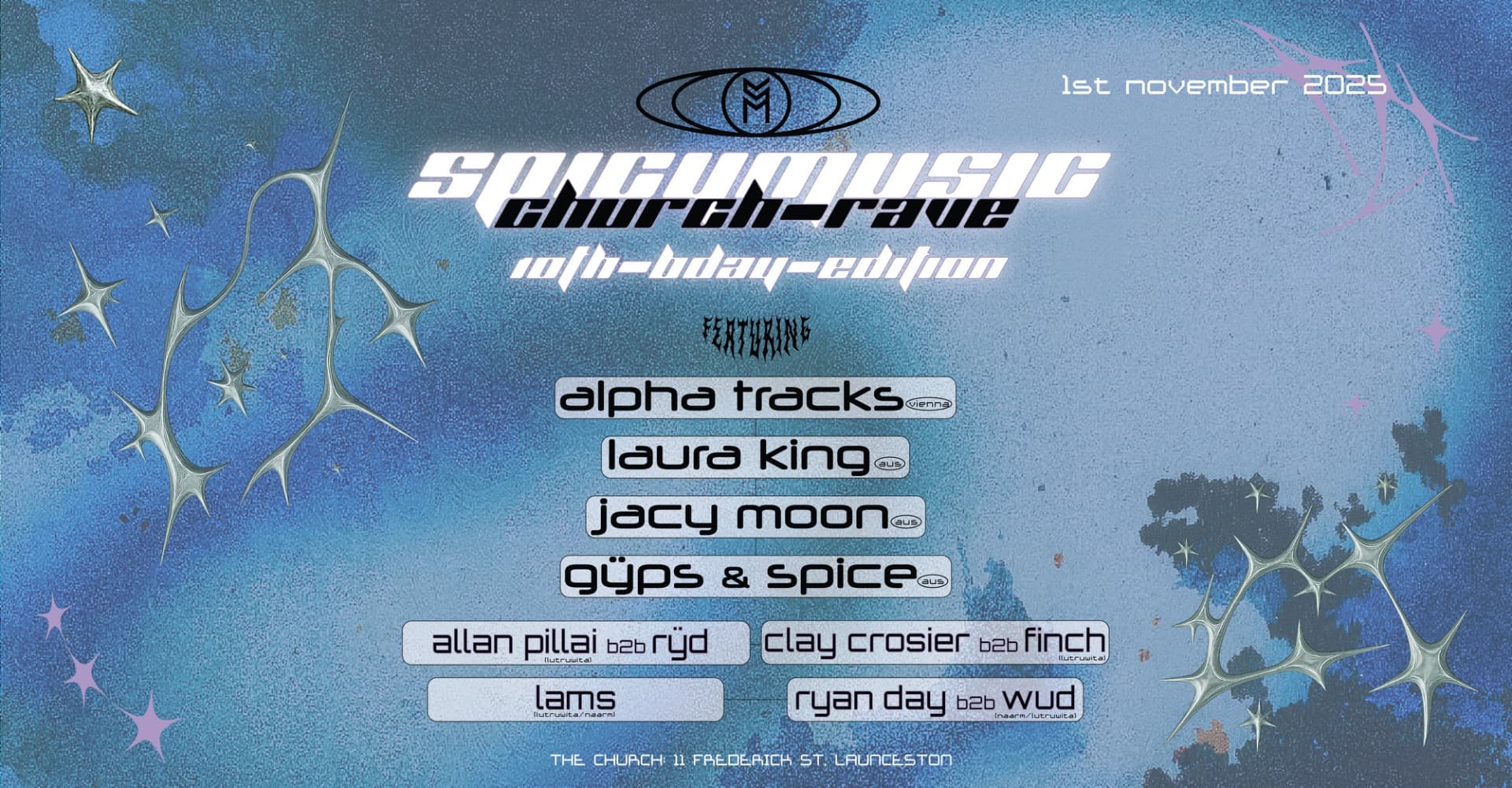 Celebrate 10 years of SPICYMUSIC & techno in Tasmania this November long weekend on Saturday 1st November 2025 w/ Alpha Tracks [Vienna], Laura King [Aus], Jacy Moon [Aus], Gÿps & Spice [Aus] + huge lutruwita/naarm supports -- The SPICYMUSIC 10th Birthday edition will be a milestone celebration of music, art, our underground community, & subculture all combined in one of the most iconic spaces we have ever used - The Church @ 11 Frederick St, Launceston.