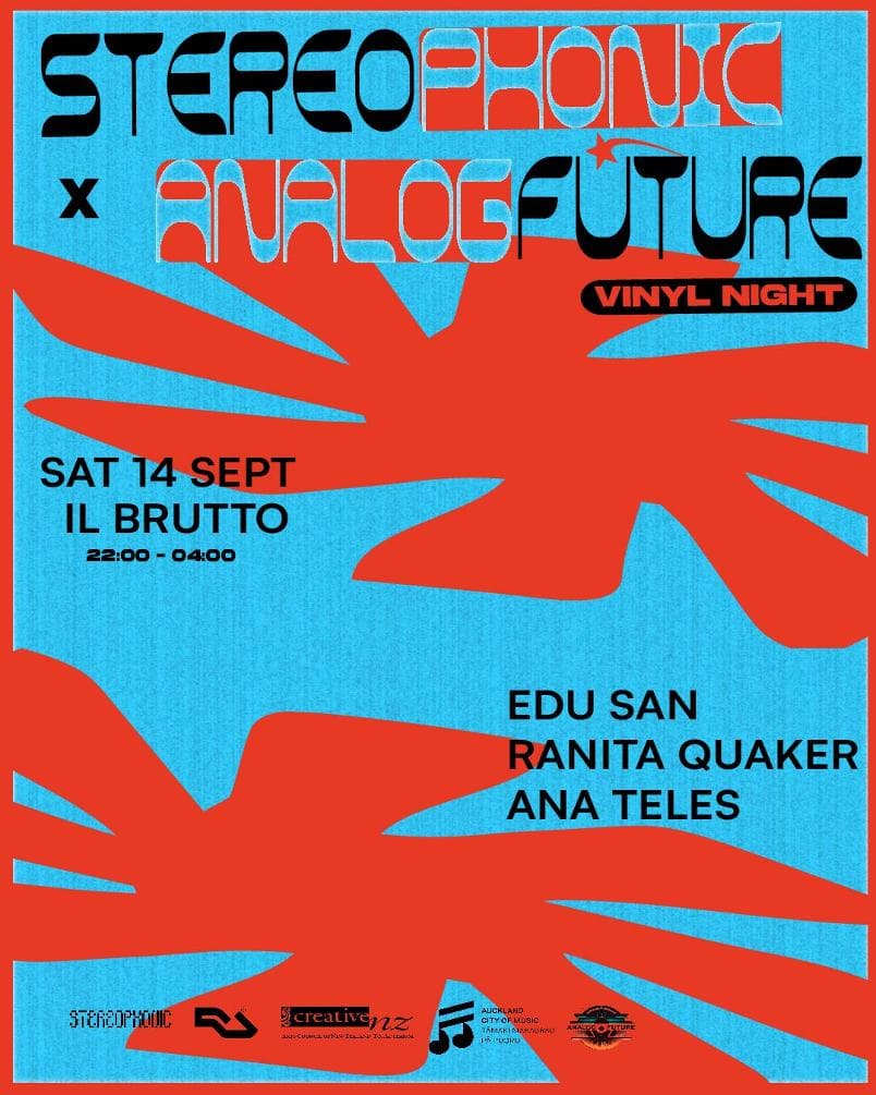 Stereophonic and Analog Future are teaming up for a special occasion in Auckland city. Featuring the Uruguayan duo Edu San and Ranita Quaker, and Stereophonics' resident Ana Teles, the two collectives join forces from different cities but with a common ground: to bring quality music to the scene in Tamaki Makaurau. Expect a night of minimal, house, breaks, electro and more. Vinyl Night.