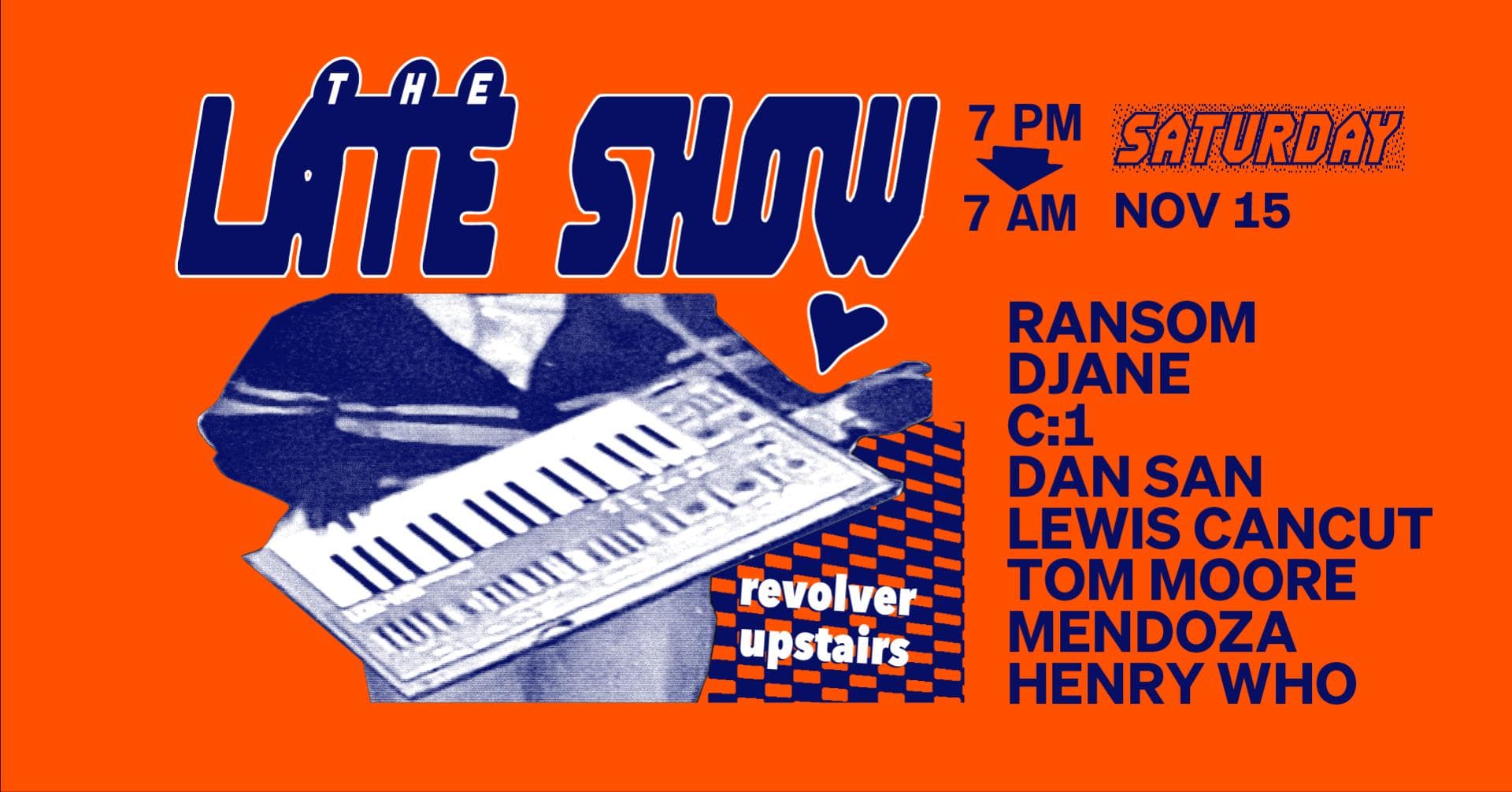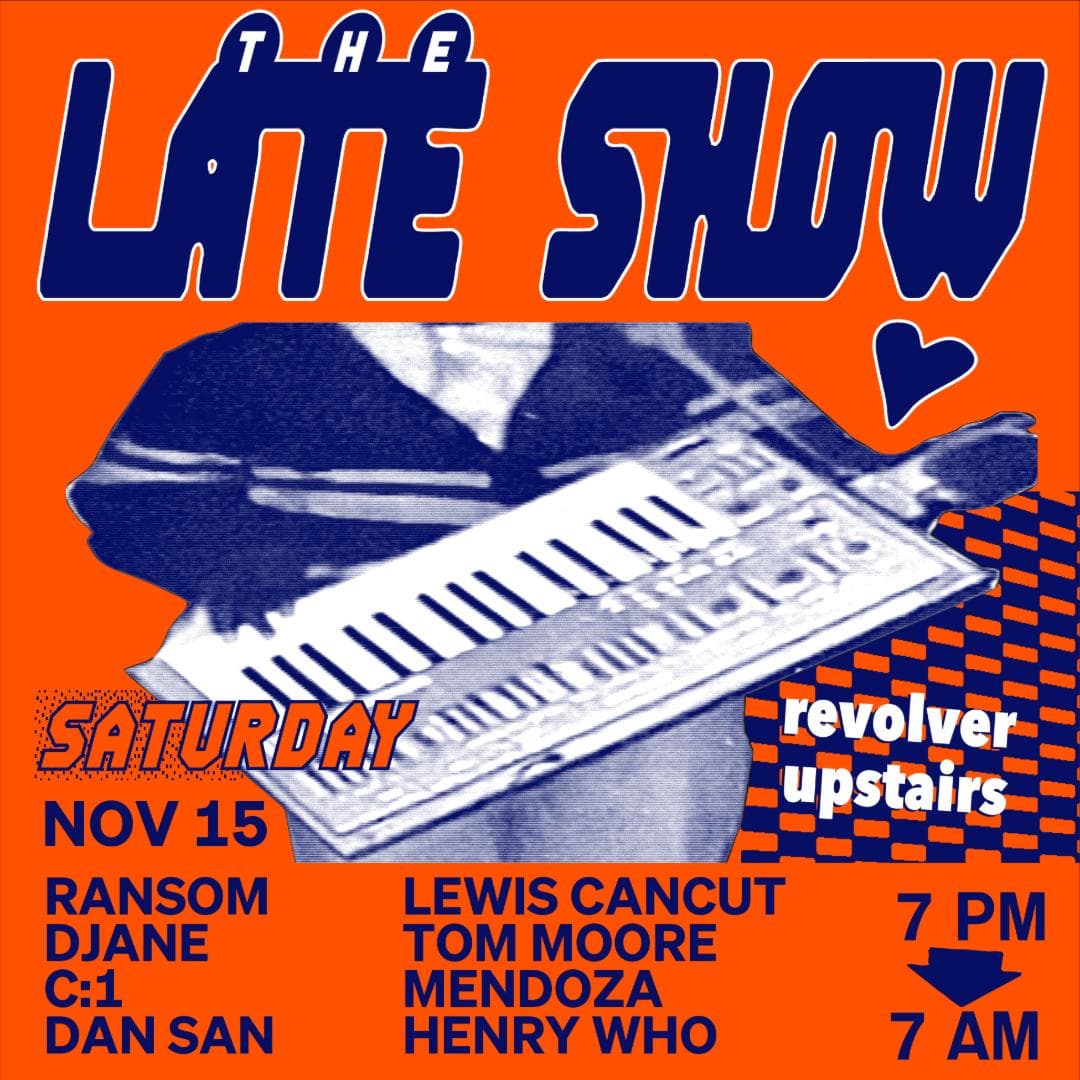 The Late Show is Revolver’s weekly Saturday night. Spread over two rooms, the night begins with Colonel Tan’s restaurant, then gathers pace around 10pm. In the front room, a barrage of Garage, Bassline, Techno and Qgom is shelled down; while in the back-bar, DJ’s splice together House with layers of Italo, Soca and Afro. Residents Ransom, Lewis CanCut and guests plus Boogs from 7am Sunday.
