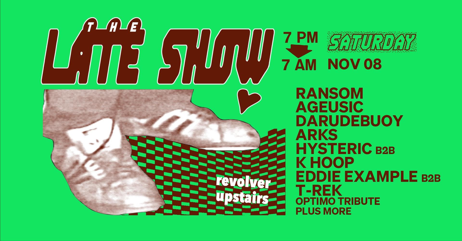 The Late Show is Revolver’s weekly Saturday night. Spread over two rooms, the night begins with Colonel Tan’s restaurant, then gathers pace around 10pm. In the front room, a barrage of Garage, Bassline, Techno and Qgom is shelled down; while in the back-bar, DJ’s splice together House with layers of Italo, Soca and Afro. Residents Ransom, Lewis CanCut and guests plus Boogs from 7am Sunday.