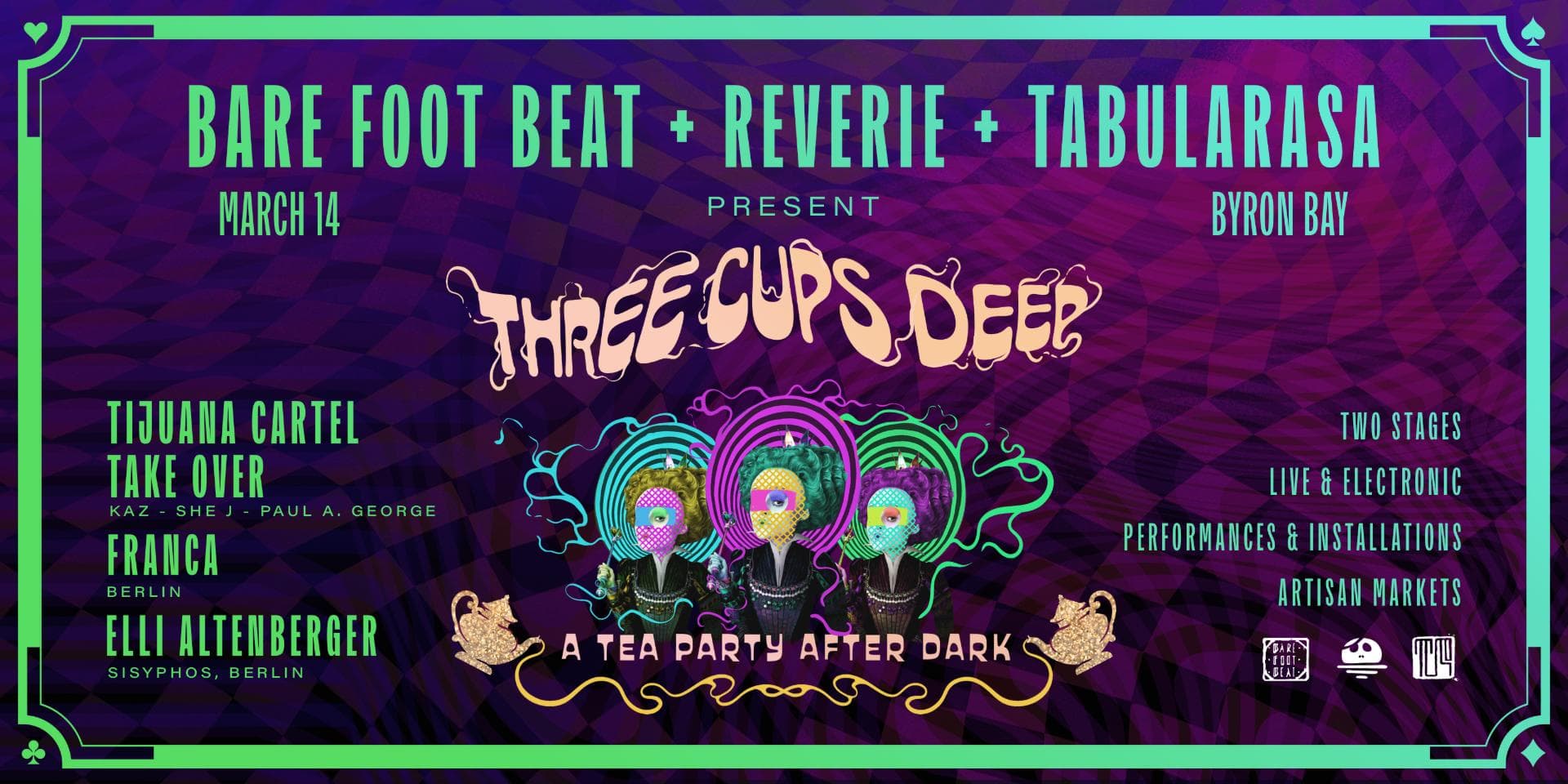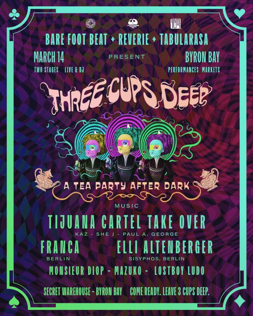 We’re turning a secret Byron warehouse into our kind of tea party: strange corners, amazing sound, pockets of surprises and colourful eye candy. Markets and makers. A Mad Tea Party bar. Techno pizza slices in hand. The Persian Lounge serving food while the night stretches and time behaves a little differently than usual.