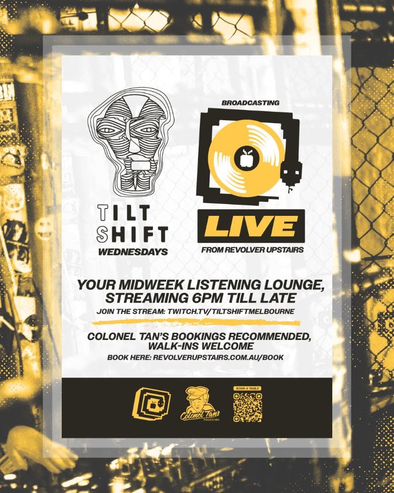 Tilt Shift invites you to dine and plug into Naarm’s electronic music community — broadcast live from the Cage on Twitch every Wednesday from 6 pm till late.
