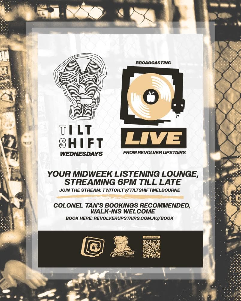 Tilt Shift invites you to dine and plug into Naarm’s electronic music community — broadcast live from the Cage on Twitch every Wednesday from 6 pm till late.