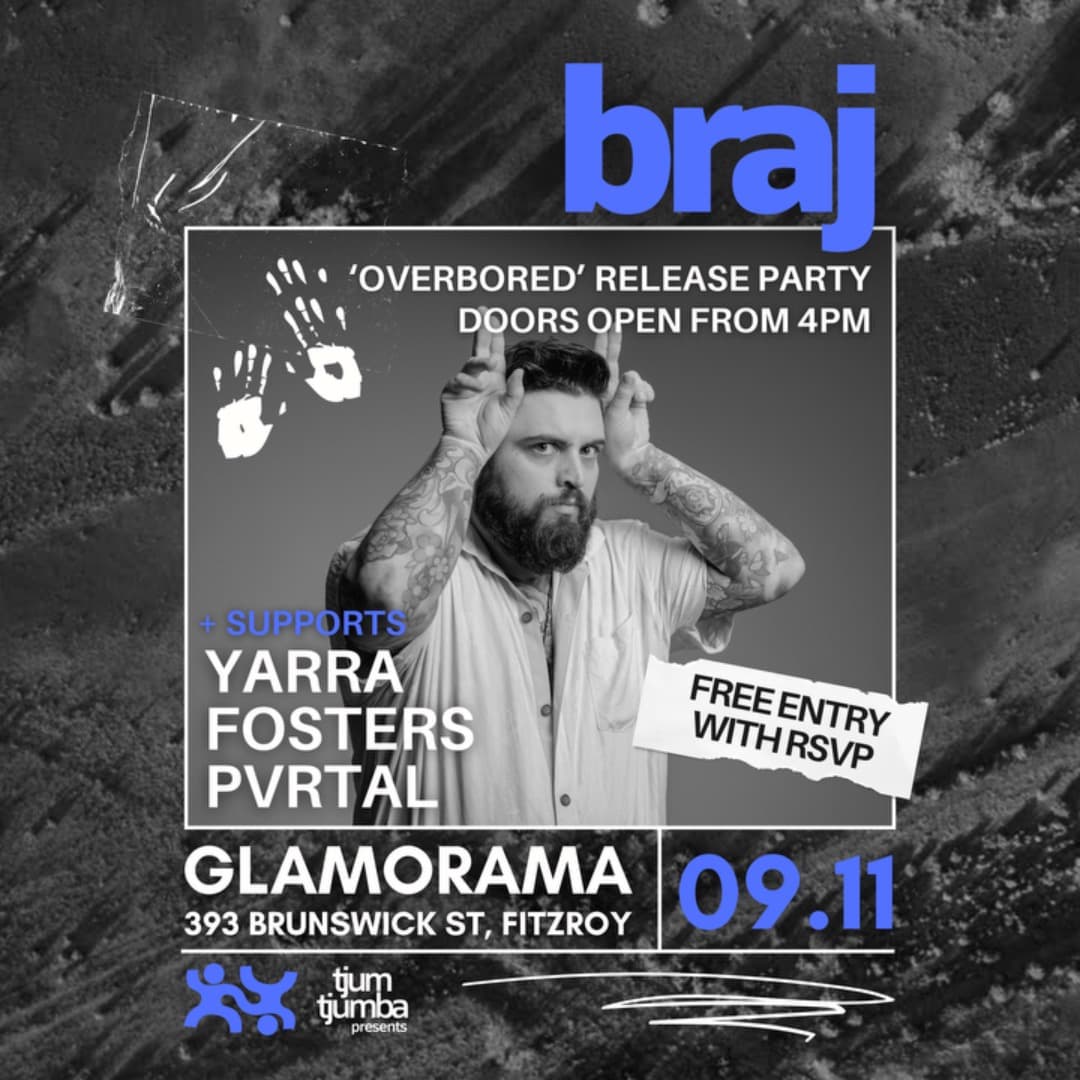 Naarm-based label Tjum Tjumba is excited to host the release party for Braj’s debut single ‘Overbored’ in Glamorama’s newly renovated courtyard. An Aboriginal-owned and led not-for-profit, Tjum Tjumba supports emerging talent and fosters creative expression within the electronic music community, amplifying underrepresented voices from Naarm and beyond.